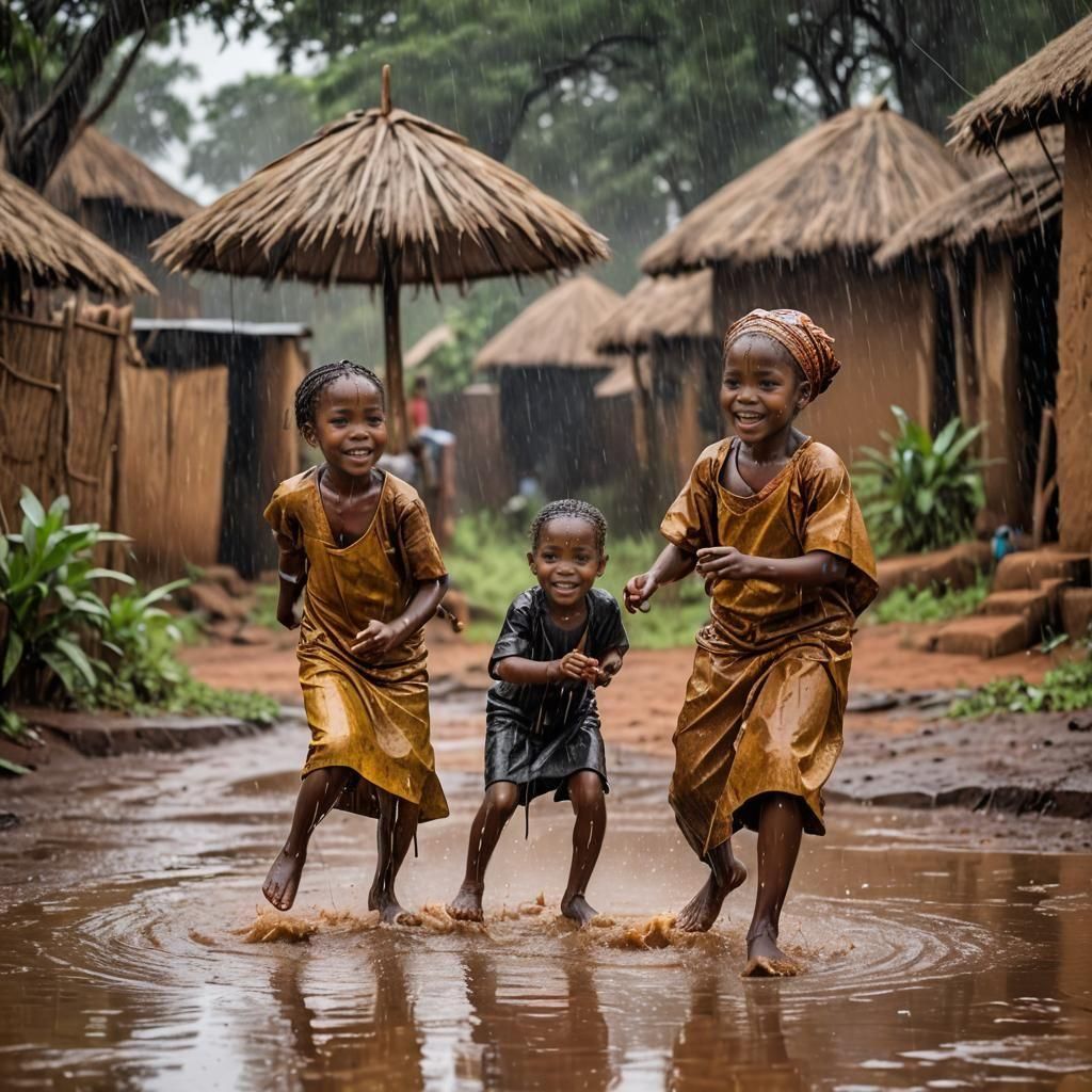 "a traditional african small girls playing in the rain, in a traditional african village setup"