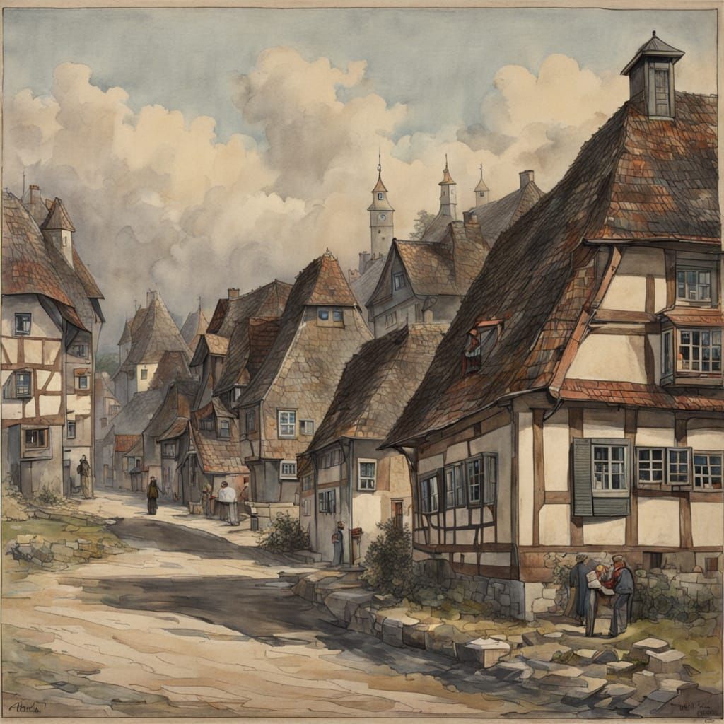 A whimsical village of mushroom houses is depicted in this image. The artwork has a cartoonish style reminiscent of a famous German comedian's artwork.
