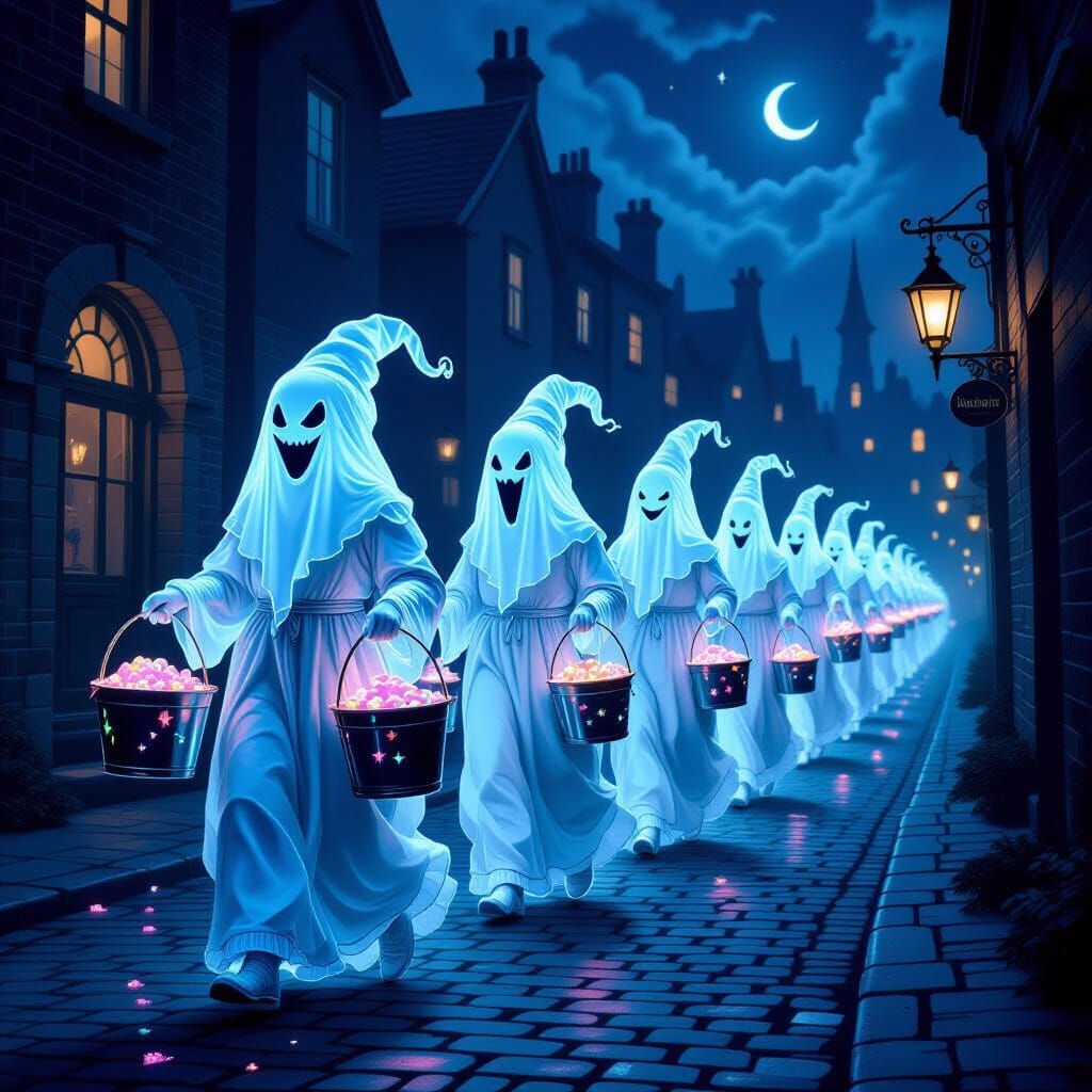 This image depicts a spectral procession of costumed ghosts carrying buckets of shimmering ectoplasm candy through a town at midnight, illuminated by an eerie glow. Rendered in a dark, whimsical fantasy art style with surreal elements.