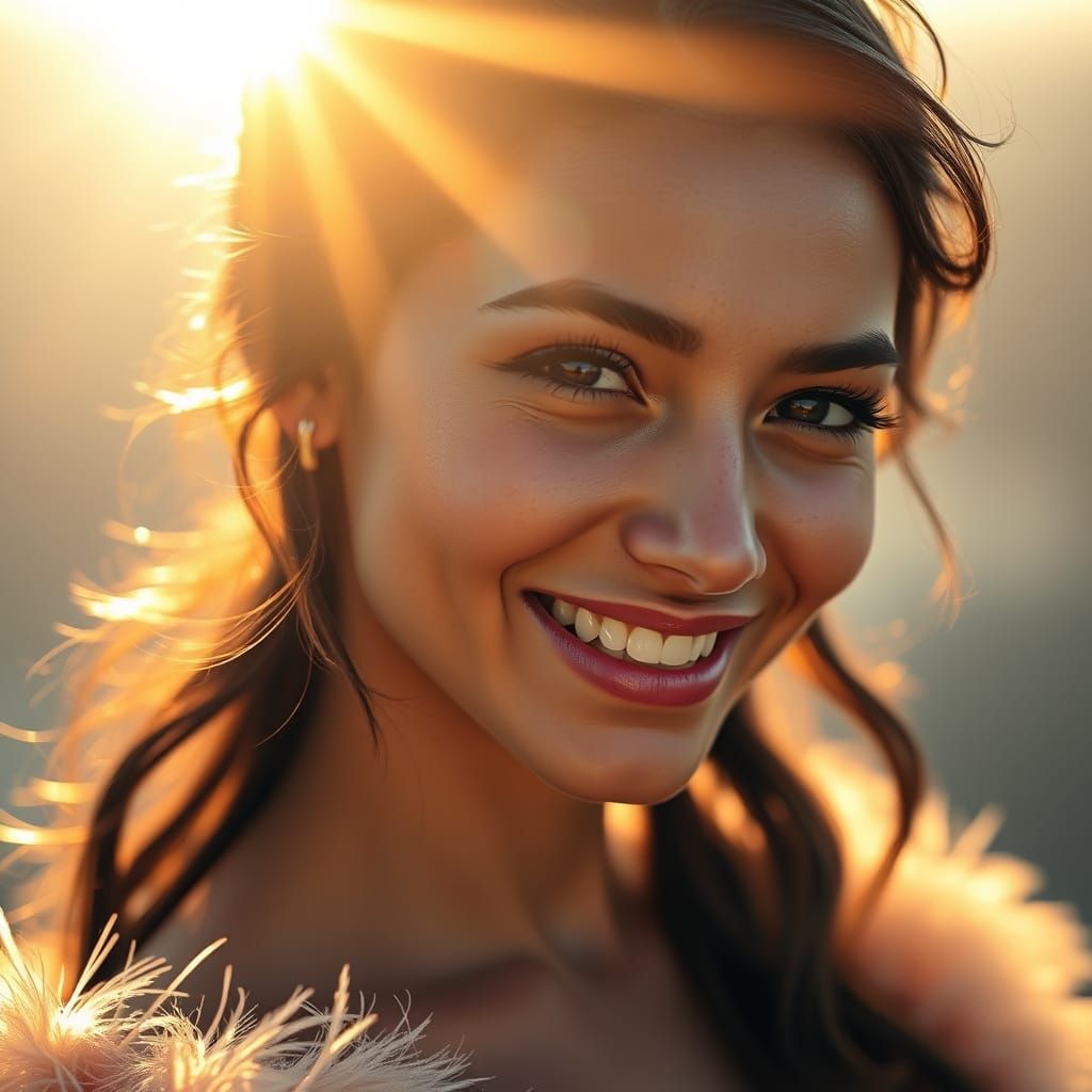 A photorealistic image of a smiling young woman in golden light. The soft lighting and delicate textures evoke a blend of vibrant color and majestic realism.