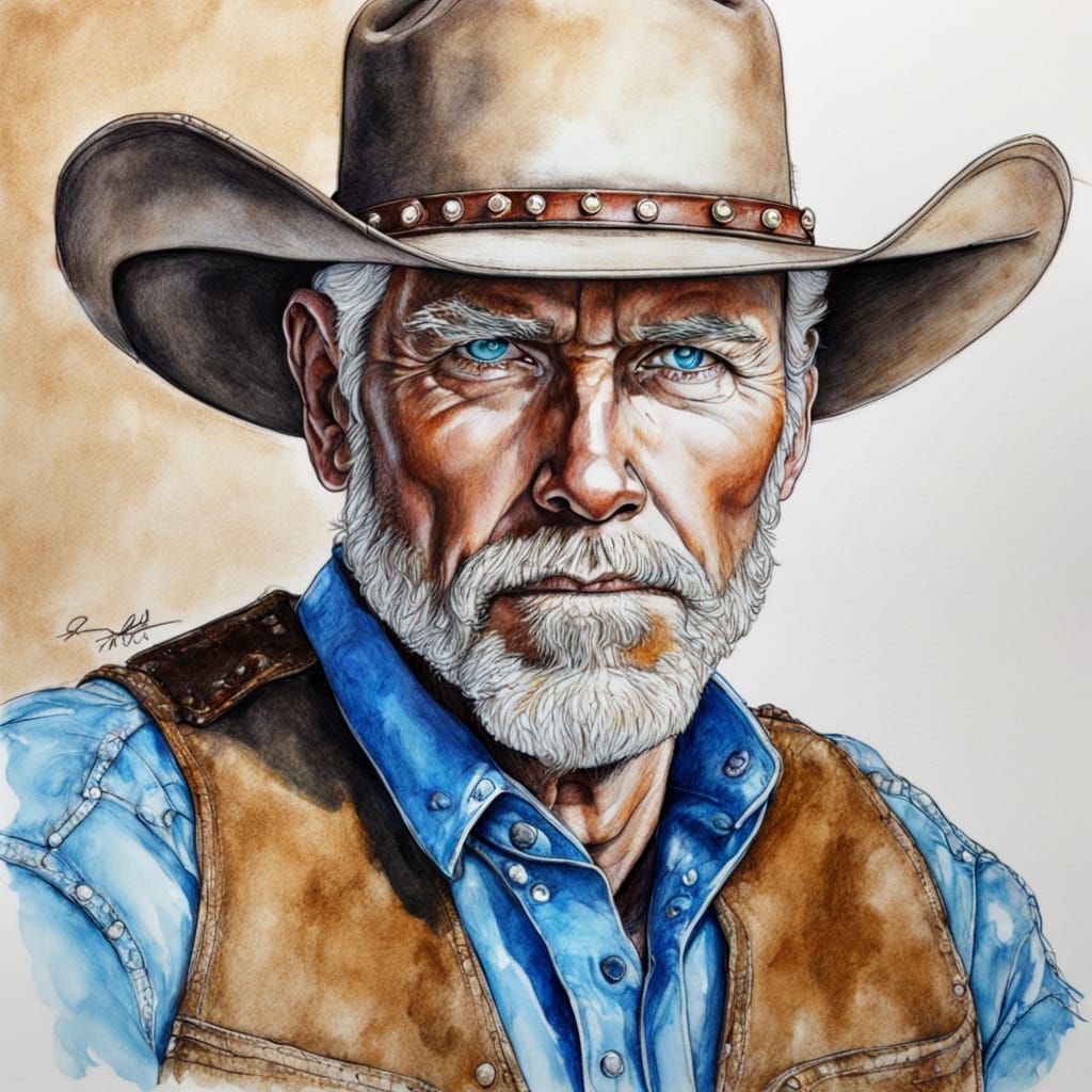 This image shows a color pencil sketch of a rugged cowboy with striking icy blue eyes. The artwork features vibrant summer colors and an alcohol ink aesthetic.