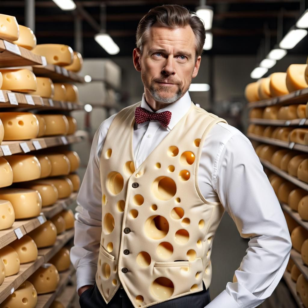 This image shows a businessman in an unusual outfit. The man is wearing a vest made of Swiss cheese, creating a bizarre and humorous visual.