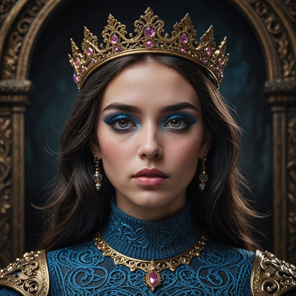 This image showcases a stunning, photorealistic portrait of a woman with blue skin, adorned in a lavish gold crown and dramatic makeup, set against a dark background with rich, high-contrast lighting.