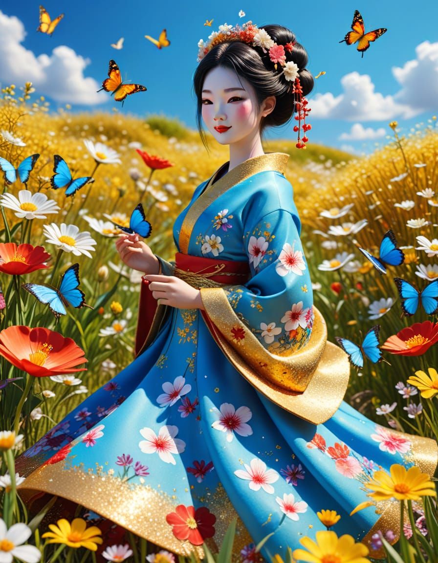 This image shows a geisha in a vibrant, traditional folk costume enjoying beach holidays in a flower meadow. The 3D render features bright spring light, blue skies, butterflies, gold glitter, and a duck.