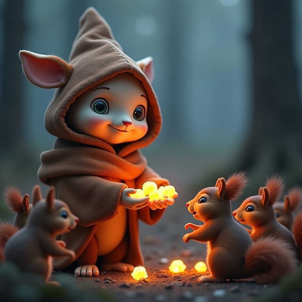 A whimsical creature offers glowing treats to squirrels in a twilight forest. Soft dusk light and long shadows enhance the magical scene, rendered as a highly detailed matte painting.