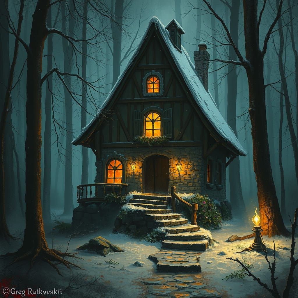 This image shows a mystical house shrouded in mist, deep within a forest. The scene is illuminated by shimmering light, rendered in a dark, fantastical style.