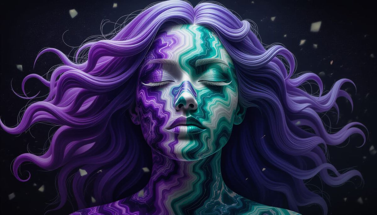 A striking picture of a face formed from swirling purple and green agate. The figure's hair flows in the wind, with ashes swirling around its head. The image is a hyperrealistic digital photograph.