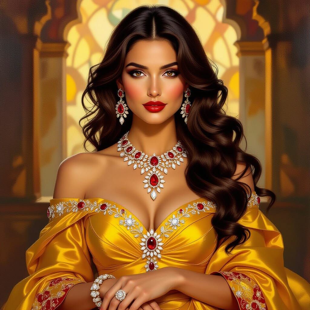 This hyperrealistic oil painting showcases a regal woman with brown eyes and hair, wearing a vibrant yellow and red stone gown, diamond necklace, and bracelet. Dramatic lighting enhances the opulent details.