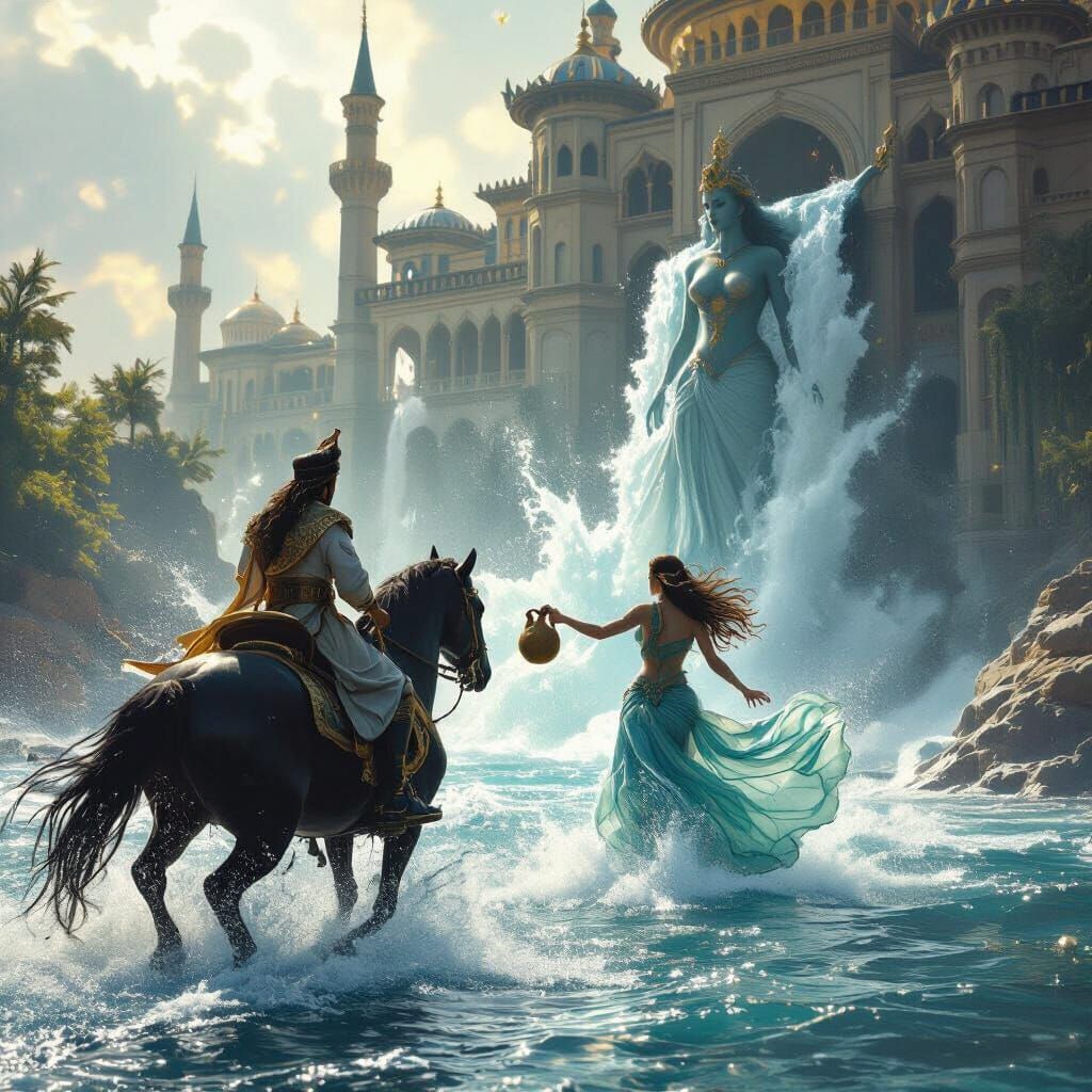 This digital matte painting depicts an Ottoman prince and a mermaid on horseback fleeing a giant matriarch. A magical river erupts, separating them in a dramatic, cinematic fantasy scene.