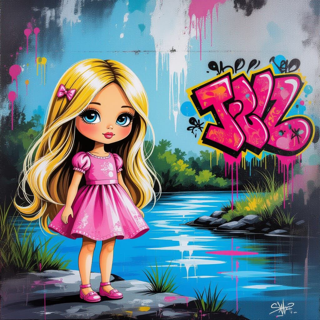 This image features a doll with long golden hair and a pink dress standing by a river. It showcases vibrant, high-contrast graffiti and street art styles with textured, melting effects.