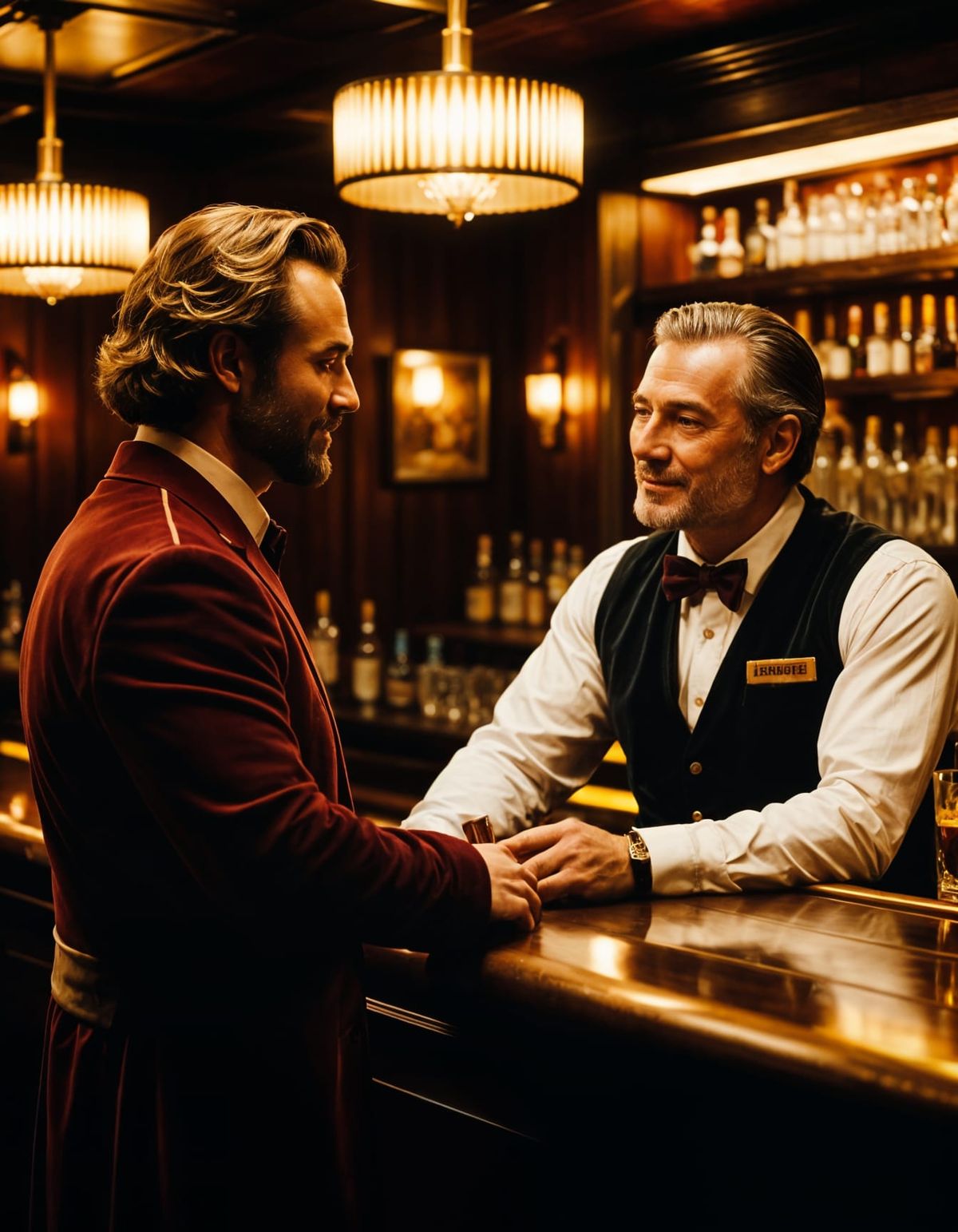 This image shows a bartender and patron in a warmly lit scene. The composition, enhanced by cinematic film grain and shallow depth of field, creates an intimate and cozy atmosphere.