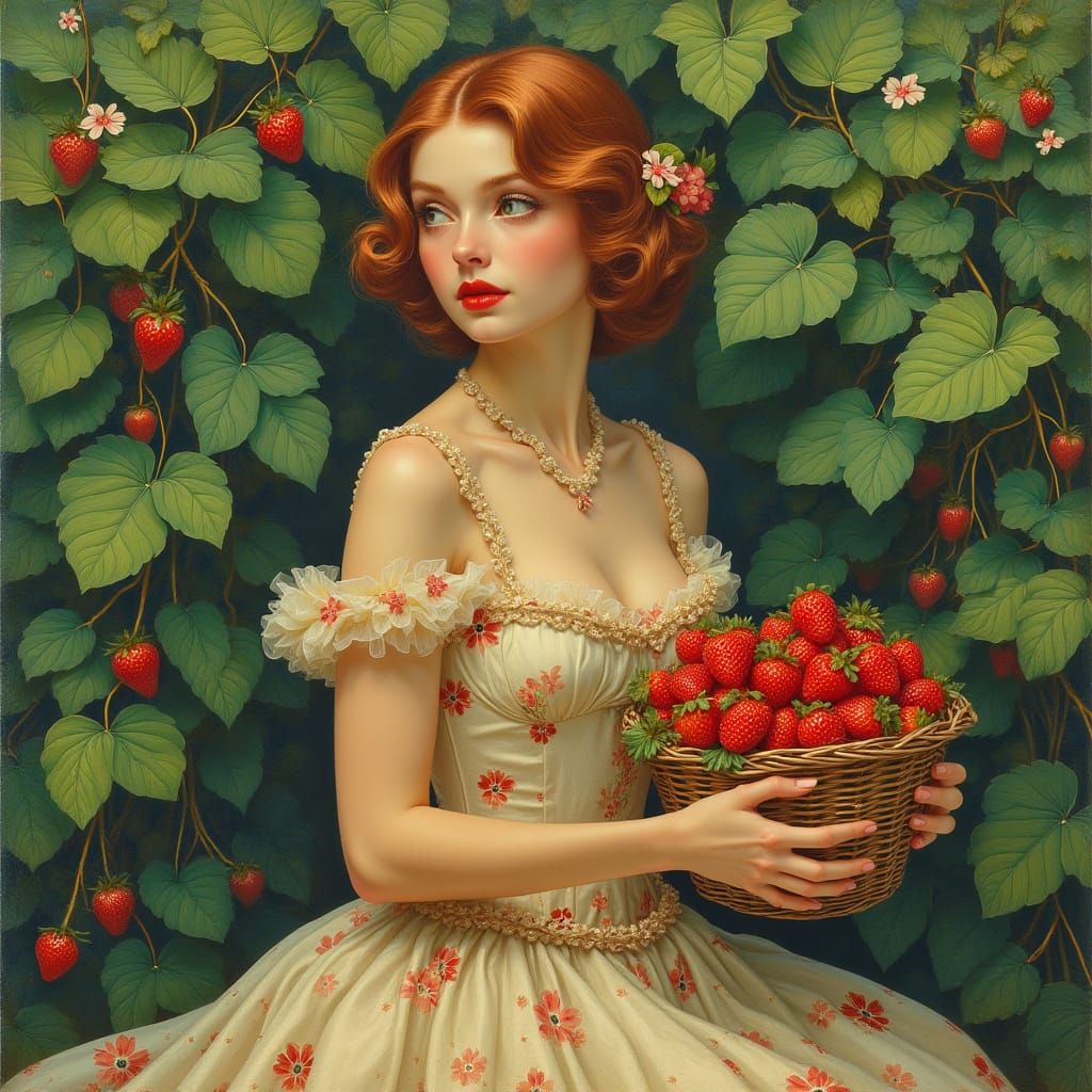 This image depicts a woman surrounded by lush greenery, holding a basket of fresh strawberries, in a style that blends Art Nouveau elegance with vibrant colors and intricate details reminiscent of dreamlike landscapes.