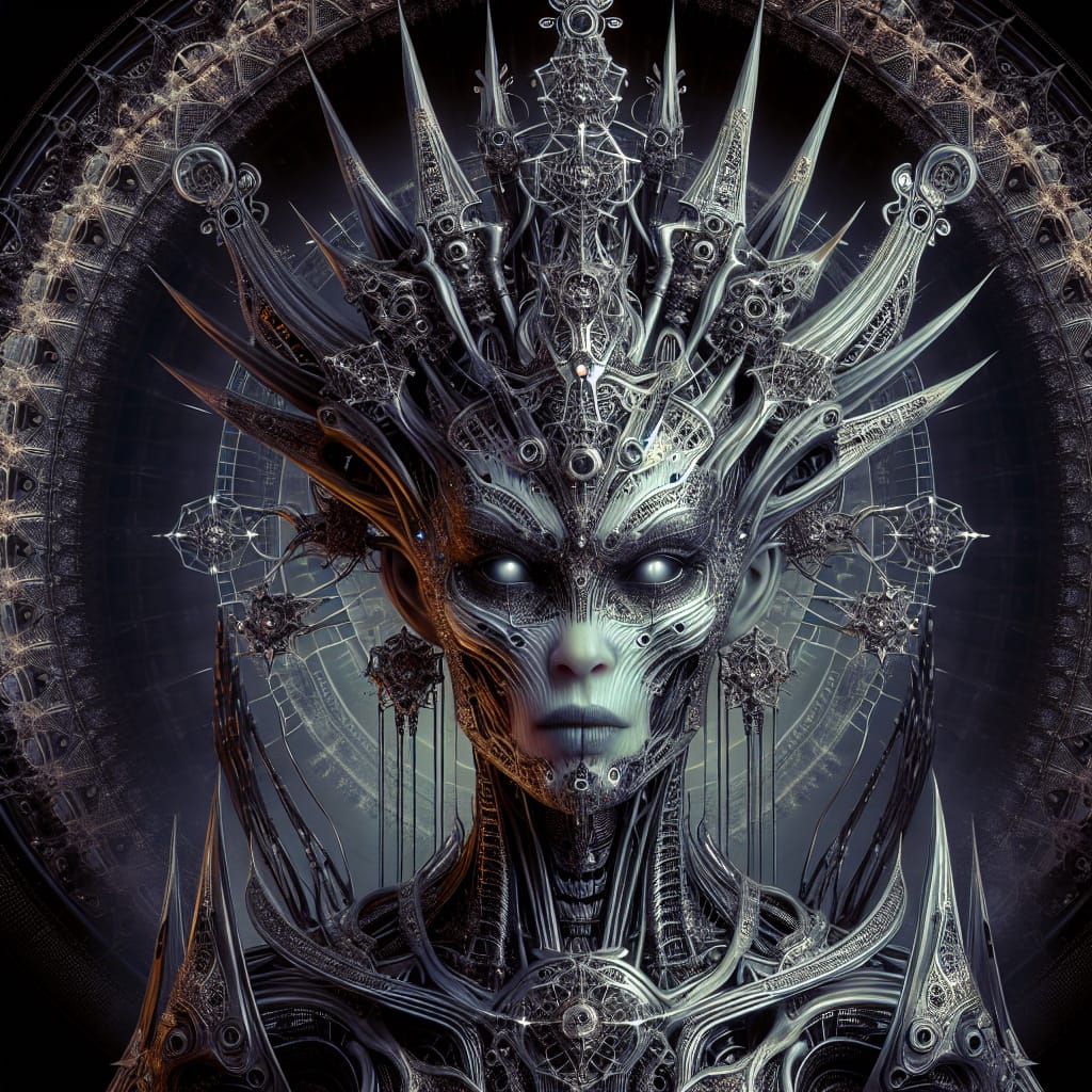 This image shows a gothic, unsettling portrait of a Necron-like extraterrestrial royal figure. The metallic princess exudes power, set against a backdrop of gothic architecture, evoking a sinister, futuristic war-torn kingdom.