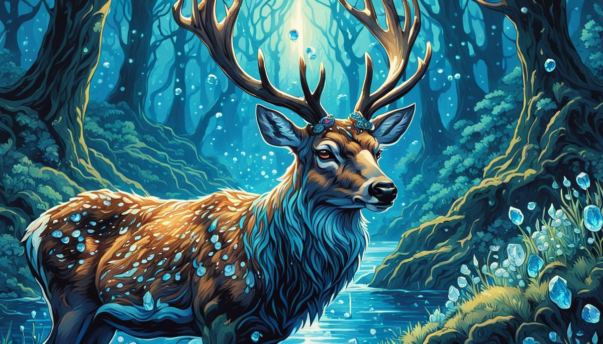 This image shows a noble deer with blue fur and crystal antlers near a spring. The artwork is in a vibrant comic book style, with glowing aqua hues and shimmering details that create a magical, ethereal underwater world.