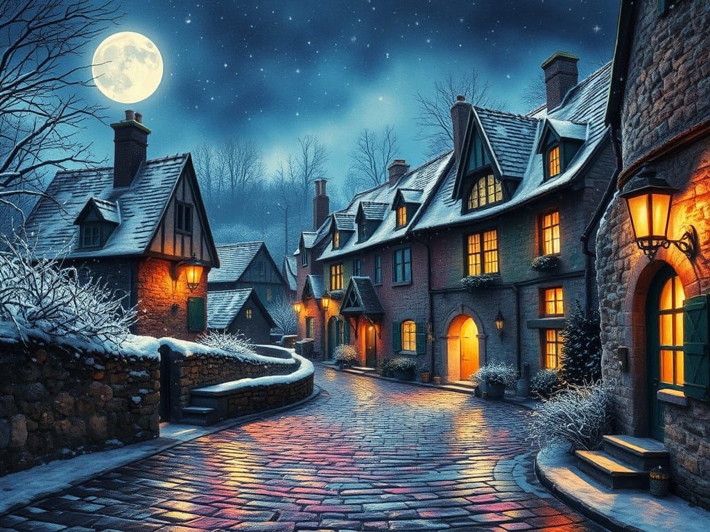 A watercolor painting of a fairy-tale village with cobblestone streets and stone cottages, illuminated by moonlight. The scene includes ink splatters, a double exposure effect and iridescent, glowing colors.