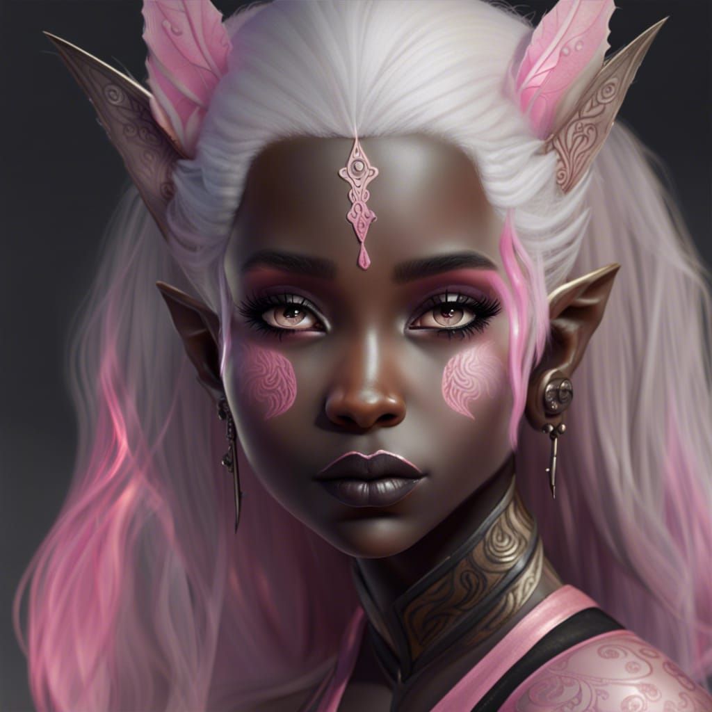 This image shows an elven ballerina with striking features. She has white hair, dark skin, and pink eyes, creating a visually arresting and unique portrait.