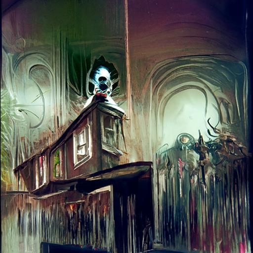 This image shows a sinister madhouse overrun by evil clowns. The scene features melting oil on canvas with a cyberpunk aesthetic, reminiscent of surreal horror art.