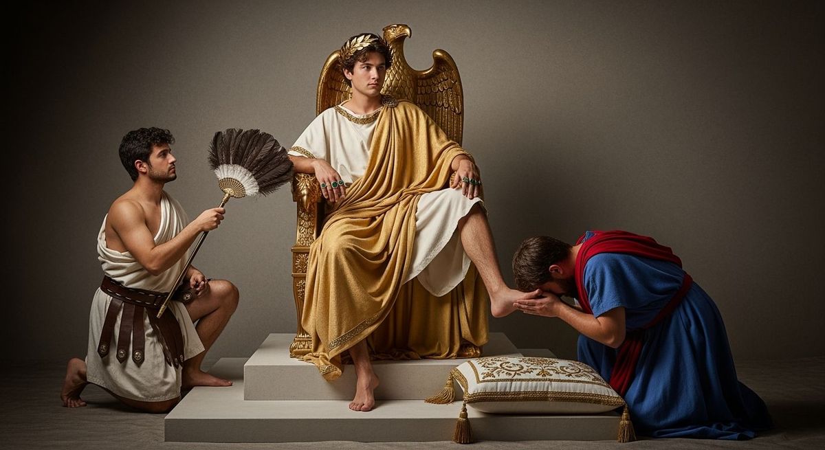 A photograph of a young Roman emperor on a throne, attended by servants. The emperor wears a gold toga and emerald crown, captured with natural lighting and sharp focus.