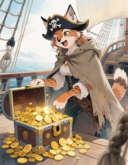 A charming anime-style image of an anthropomorphic lynx opening a treasure chest overflowing with gold on a galleon deck. The character is wearing a pirate hat and cloak, rendered with soft watercolour art.