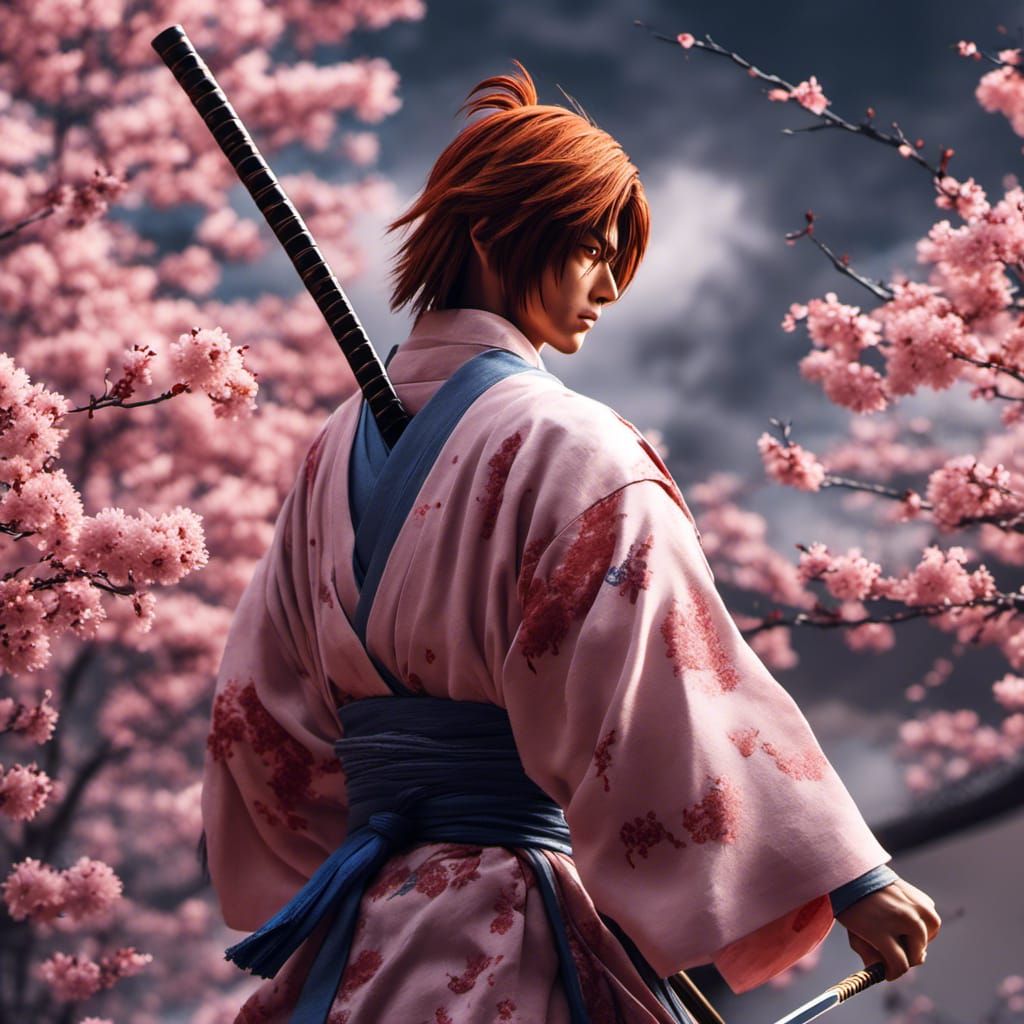 This image shows Ruroni Kenshin in a dynamic fighting stance, katana in hand, set against a backdrop of Tokyo cherry blossoms rendered in a pastel anime style.