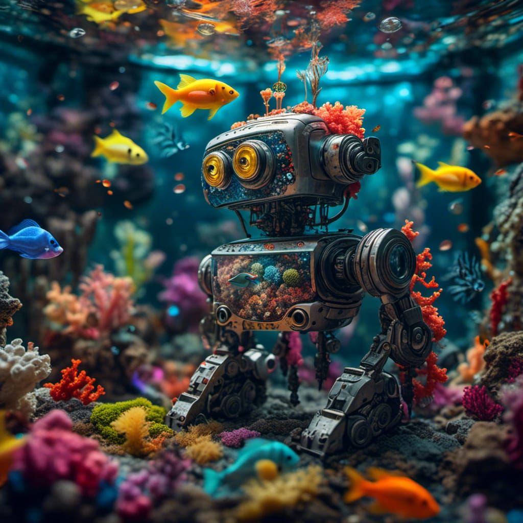 This image shows a small, cute robot in a fish tank with colorful fish and coral. The hyperrealistic digital photography features soft, gleaming light and intricate details.