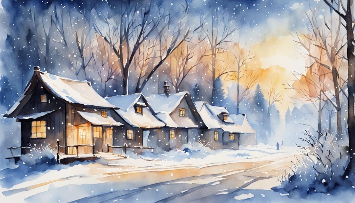 This image shows a serene winter wonderland with a Japanese cottage in the background, set against a snowy landscape. A delicate icicle dreamcatcher hangs from a beam, surrounded by softly glowing snowflakes and frosty mist. The scene is rendered in a vibrant watercolour style with gentle brushstrokes an...