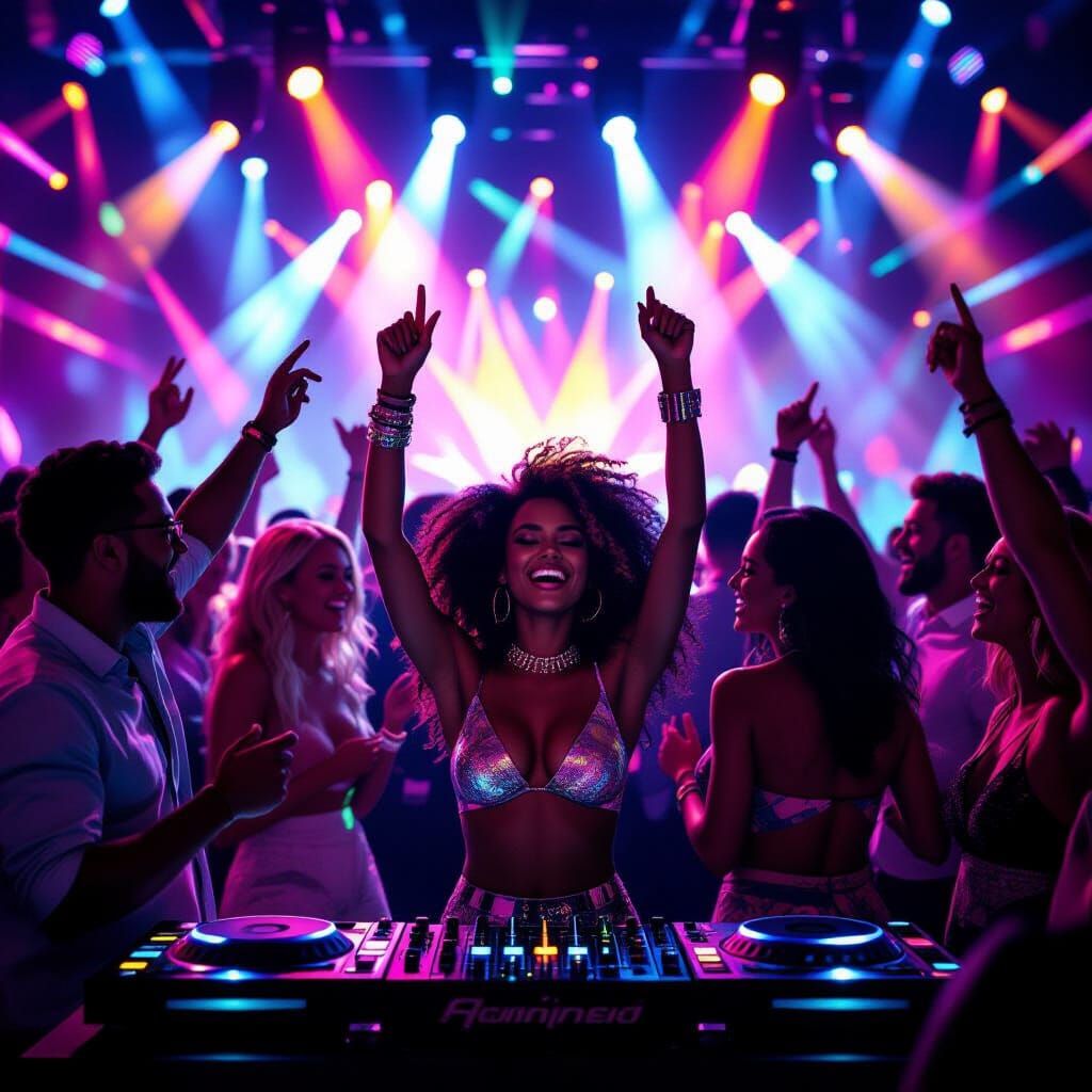 The dance floor is alive with vibrant colors and infectious energy. Pulsing lights flash in time with the thumping bass, illuminating the ec...
