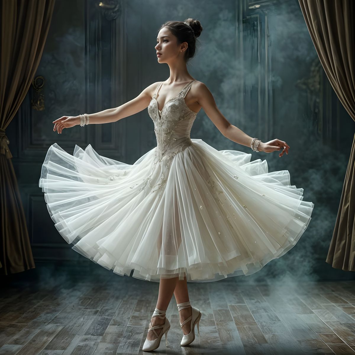 A captivating image of a ballerina gracefully spinning in a dimly lit studio. She wears a white dress embroidered with diamonds, her brunette hair in a bun. The image evokes a sense of refined beauty.