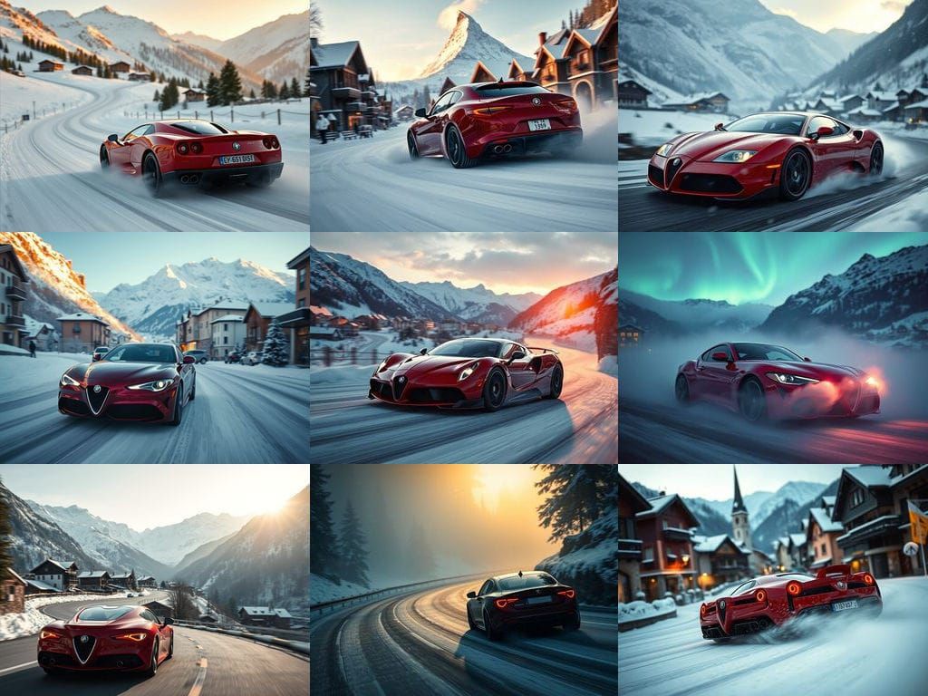 This cinematic film still captures a dramatic moment of a red Alfa Romeo Murcielago drifting over the picturesque Swiss town of Zermatt, shot in a film grain aesthetic with cinematic lighting and post-processing techniques