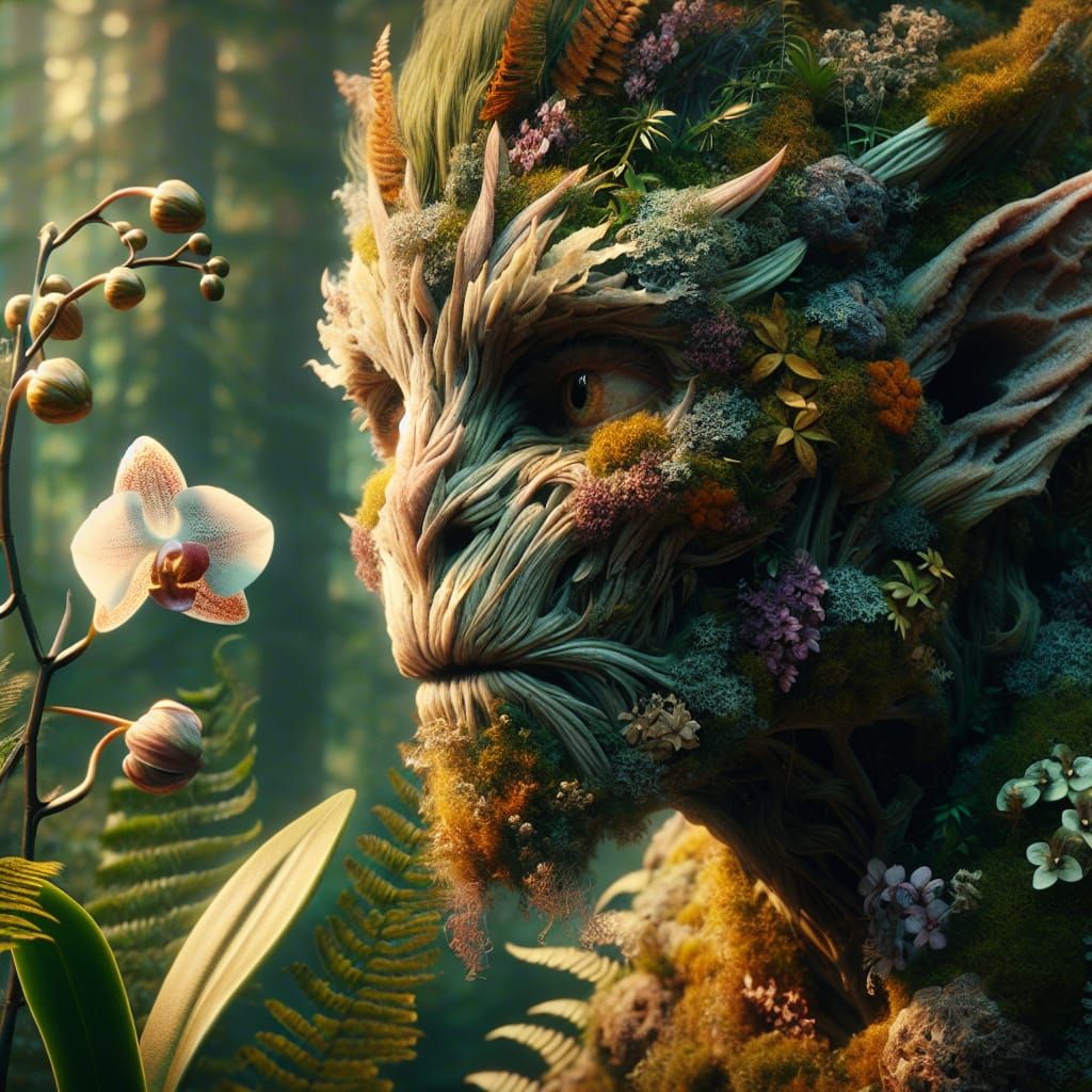 This image shows an anthropomorphic creature crafted from ferns and lichen, standing in a woodland. The macro photograph style highlights the creature's expressive face as it appears to smell an orchid, rendered with vibrant, earth-toned colors. The image has a romantic and symbolic aesthetic.