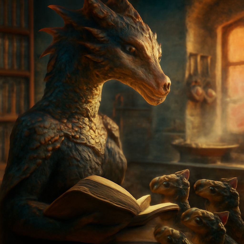 This enchanting image depicts a dragon princess reading to her family in a cozy kitchen, where the warm glow of the scene is contrasted with the vibrant scales of the princess and the dramatic lighting effects. Created in a hyperrealistic style, the artwork showcases intricate details and a colorful back...