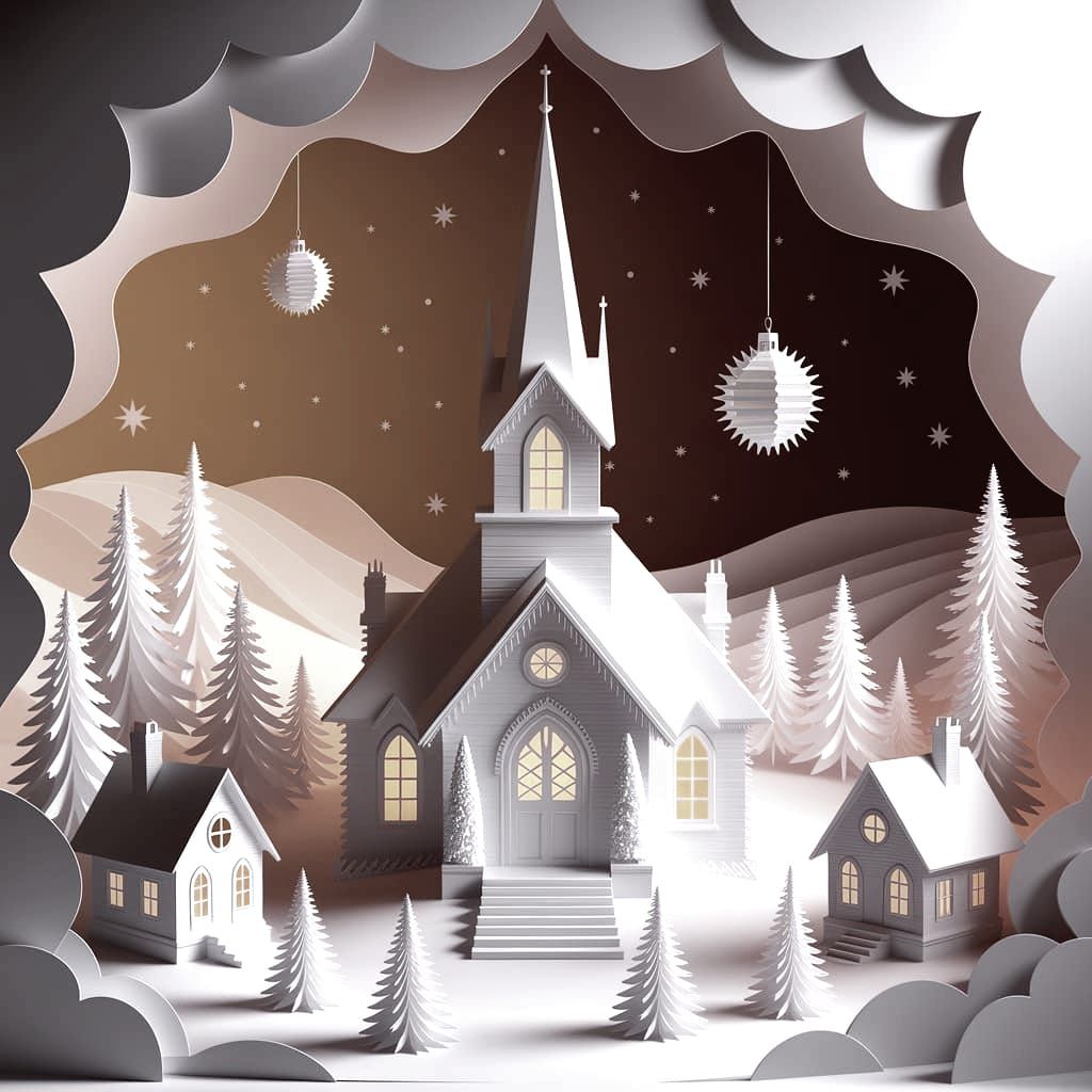 This digital illustration captures Santa's village crafted from intricate kirigami paper art. Warm golden light illuminates snow-dusted cottages and a central chapel, evoking cozy Christmas magic.