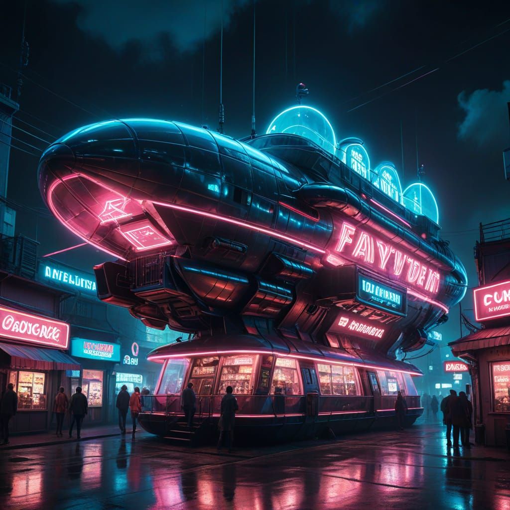 This image shows a whimsical cotton candy shop airship in a cyberpunk aesthetic. The scene is neon-lit with retro-futuristic elements, rendered with vibrant colors and a nostalgic atmosphere.