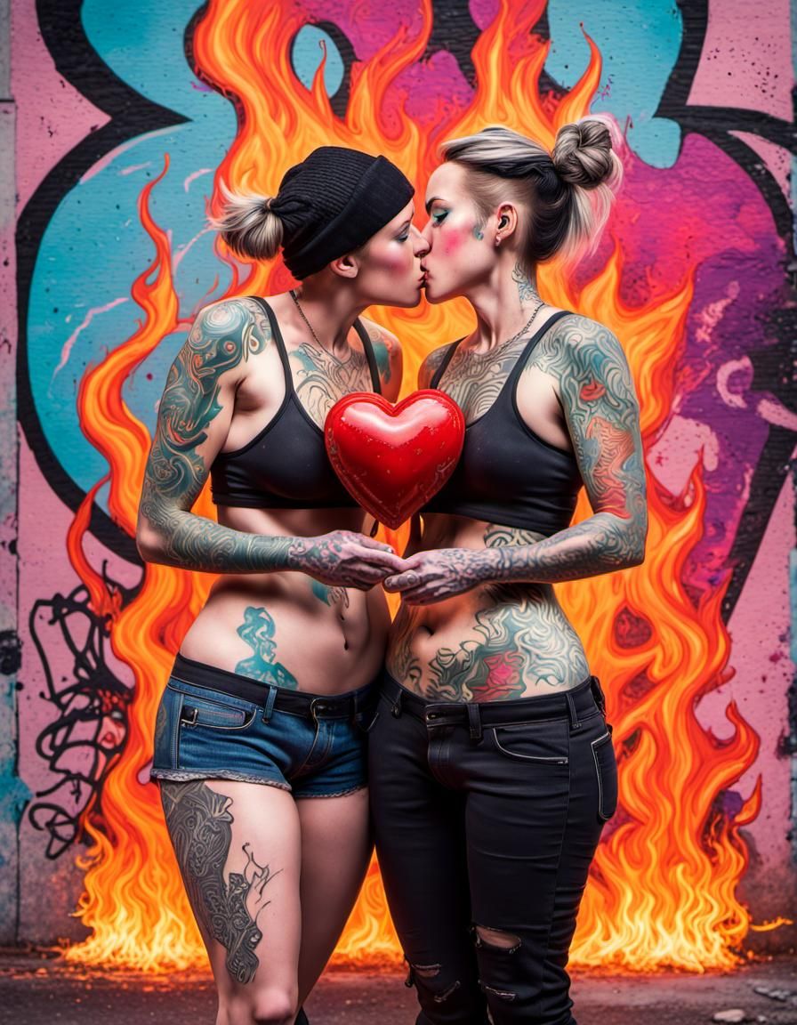 This image shows two tattooed women kissing while holding a heart-shaped grenade. The artwork is rendered in a graffiti art style, with vibrant colors and melting effects.