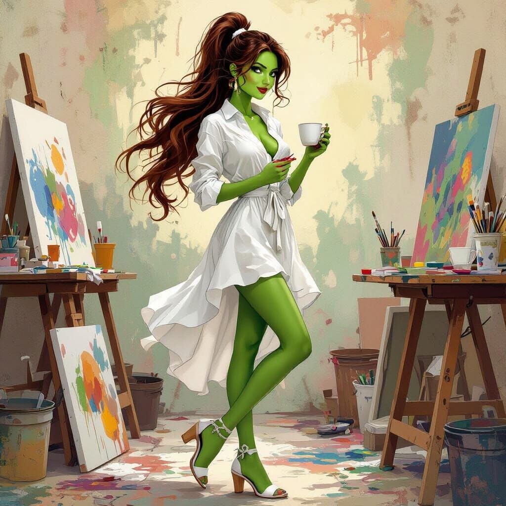 A vibrant image of a beautiful, green-skinned artist in her studio. She wears a sundress and holds a coffee cup and brush, surrounded by canvases, in an art nouveau style with expressive brushstrokes.