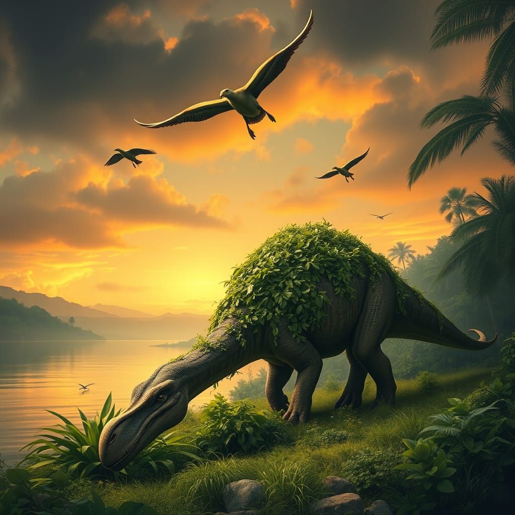 A tranquil image of a sauropod dinosaur grazing by a waterfront. Pterosaurs fly above the lush, dense canopy in this scene rendered with surreal and atmospheric digital painting techniques.