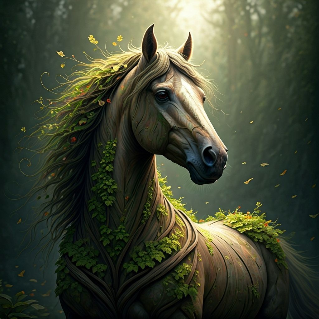 This image shows a majestic warhorse, transformed with druidic magic. The horse embodies nature with a flowing mane of foliage and vines, rendered in earthy tones with wood and bark textures.