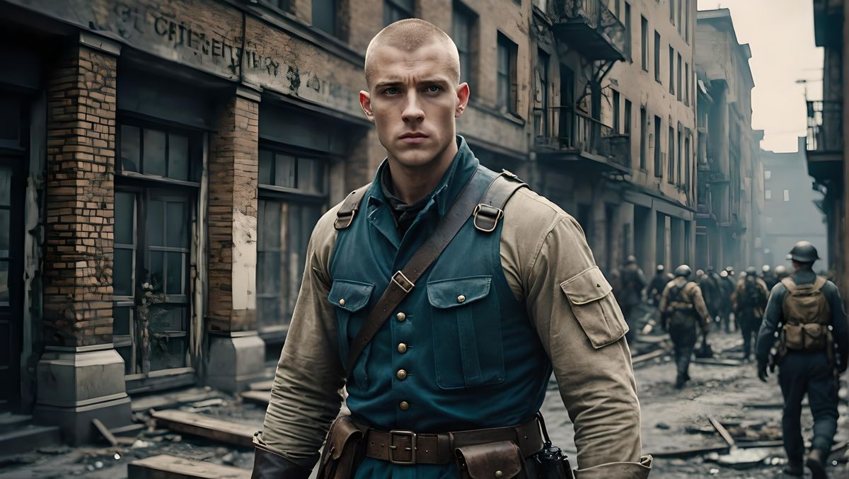 This image shows a handsome WWI soldier walking through a ruined cityscape. The photo-realistic image features film grain, cinematic lighting, and steampunk elements.