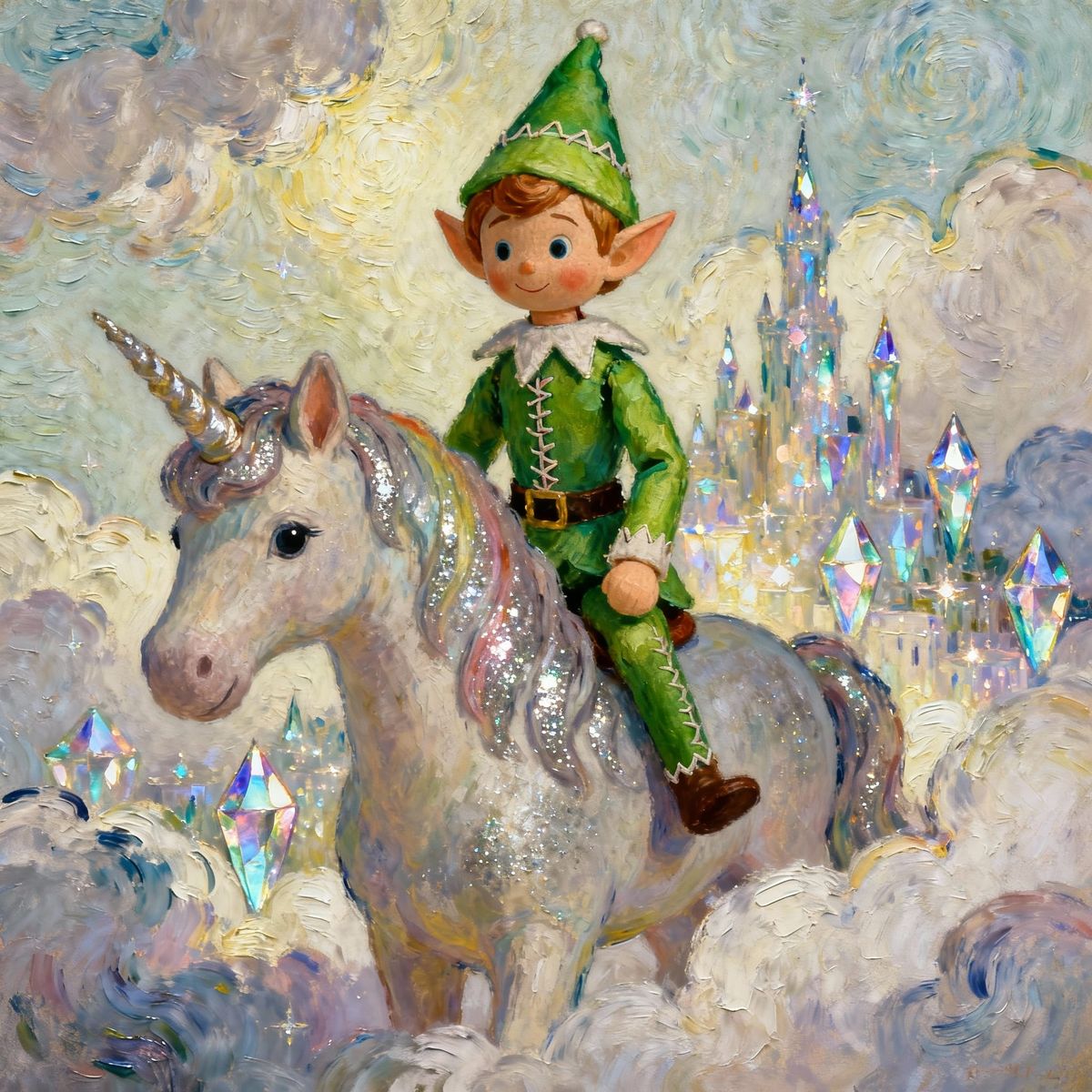 This image depicts an elf toy on a unicorn with a rainbow mane, set in a fantastical cloud city. Rendered in an expressive, painterly style with bold strokes and soft washes.