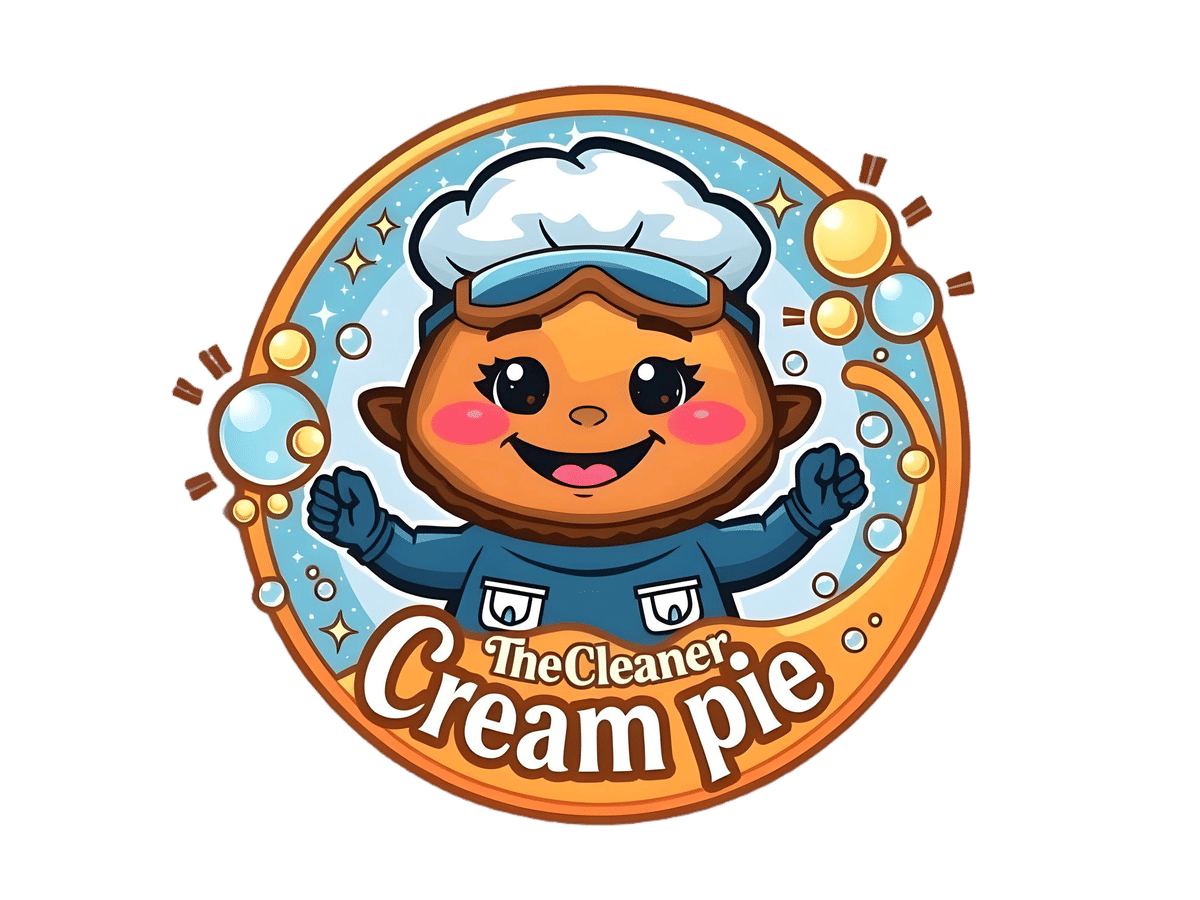 A creative and vibrant logo for the "Cream pie" liquid cleaner brand. The design features a cute, anthropomorphic pie character with a gleaming smile. It is wearing a cleaning outfit, complete with a hat, gloves, and goggles. The pie is surrounded by sparkling bubbles, representing the liquid cleaner. The brand name "Cream pie" is written in a playful, cursive font, with a subtle gradient that transitions from light blue to dark blue, giving it a fresh and clean appearance.