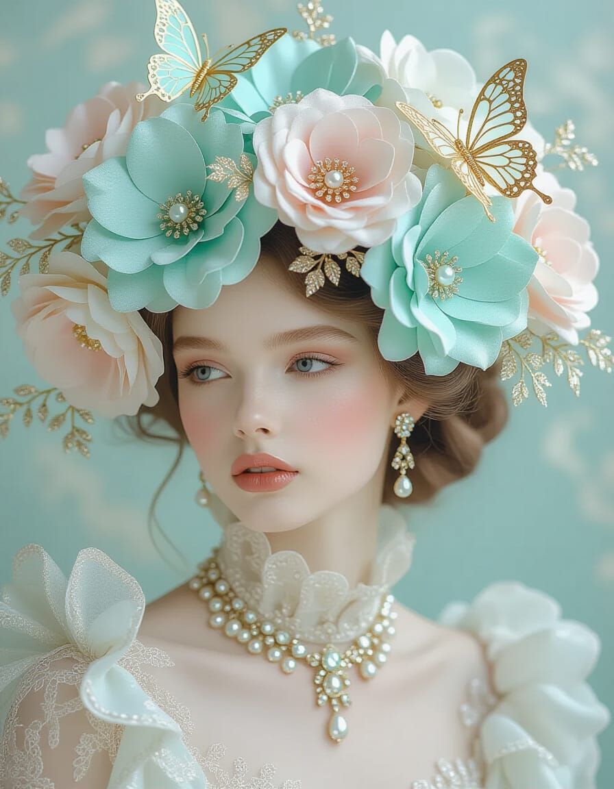 This image shows an airy female portrait intertwined with delicate turquoise and pink silk flowers. Gold filigree, gem-encrusted cores, and pearl accents create a rococo fantasy, with a soft, diffused light.