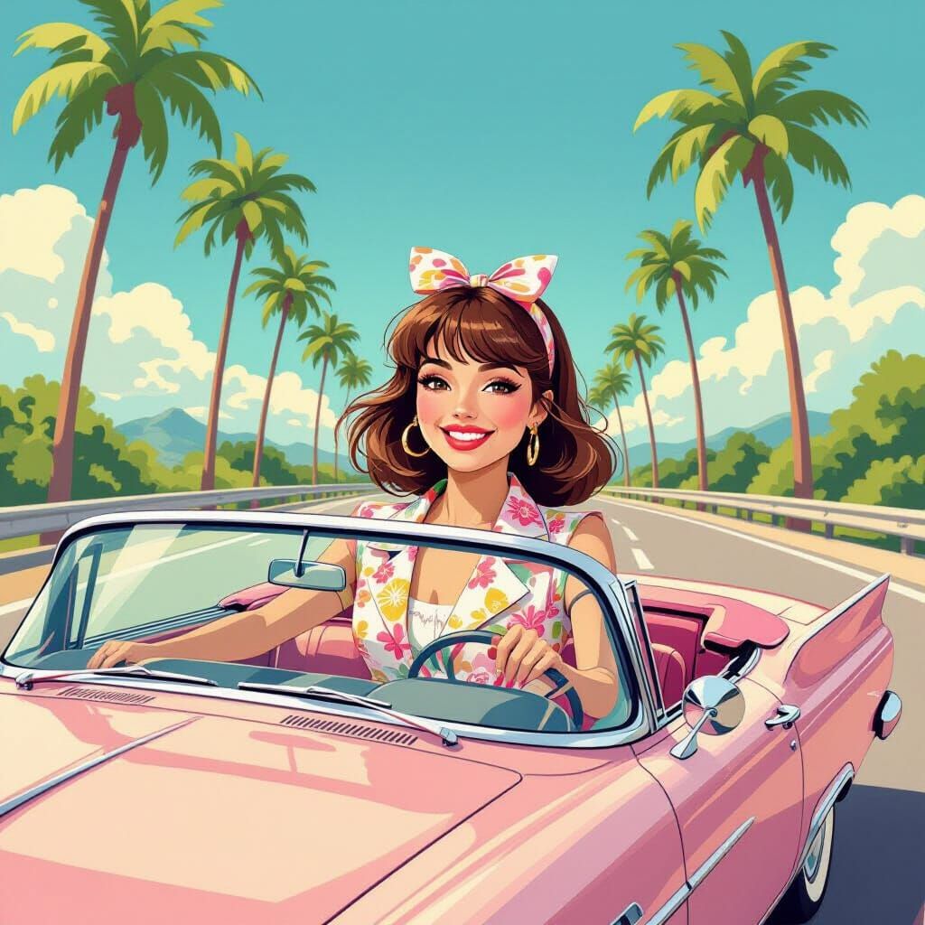 This image shows a smiling woman driving a vintage convertible on a sunny highway with palm trees. The image has a nostalgic 1960s feel and a blend of realism and cartoonish elements in a pop art style.