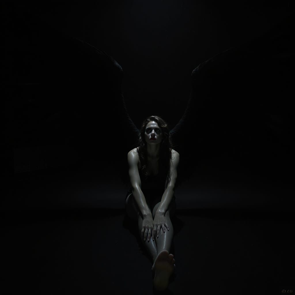 This image shows a woman sitting powerfully in dim light, with shadow wings emerging behind her. High-contrast realism and dynamic lighting create a poetic, still atmosphere with piercing detail.