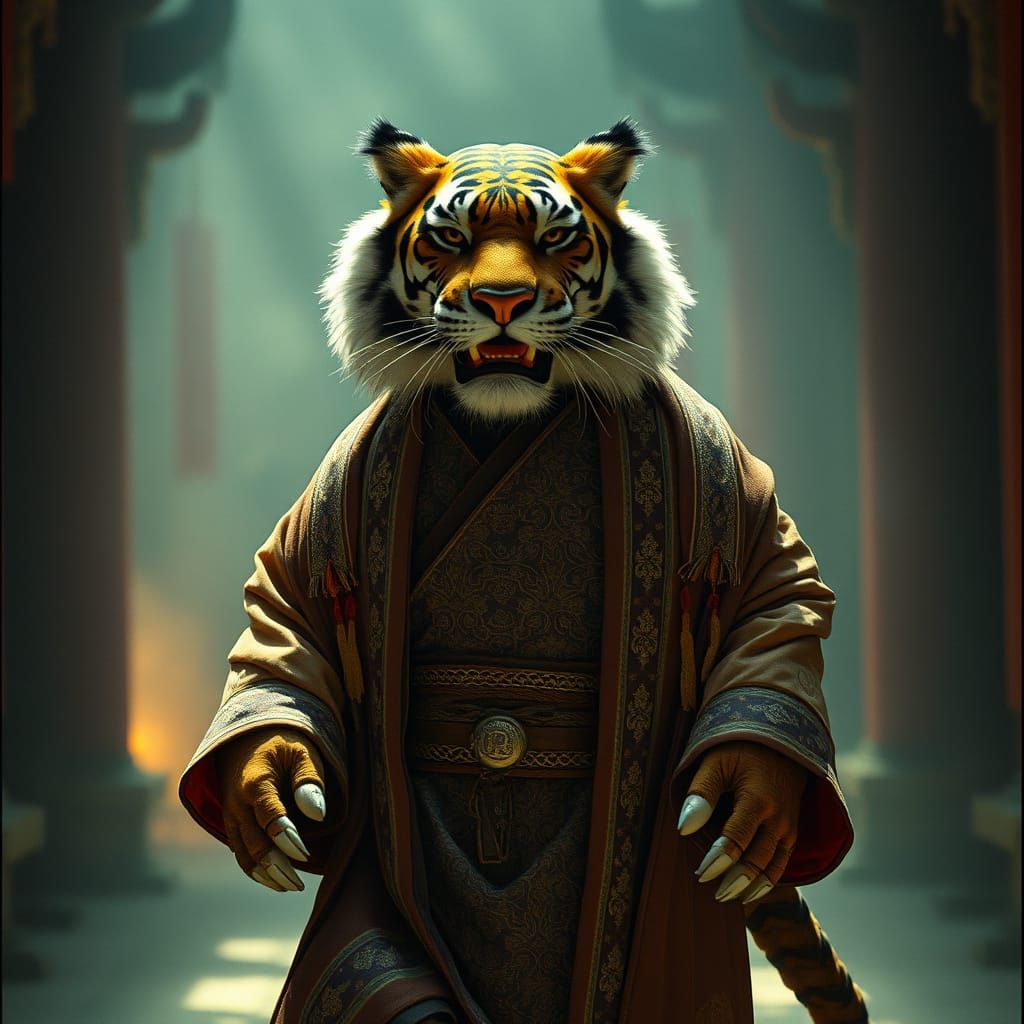 This image shows a majestic tiger cleric in embroidered robes, standing heroically in an ancient fantasy world. The cinematic lighting, film grain, and color grading create a dramatic effect.