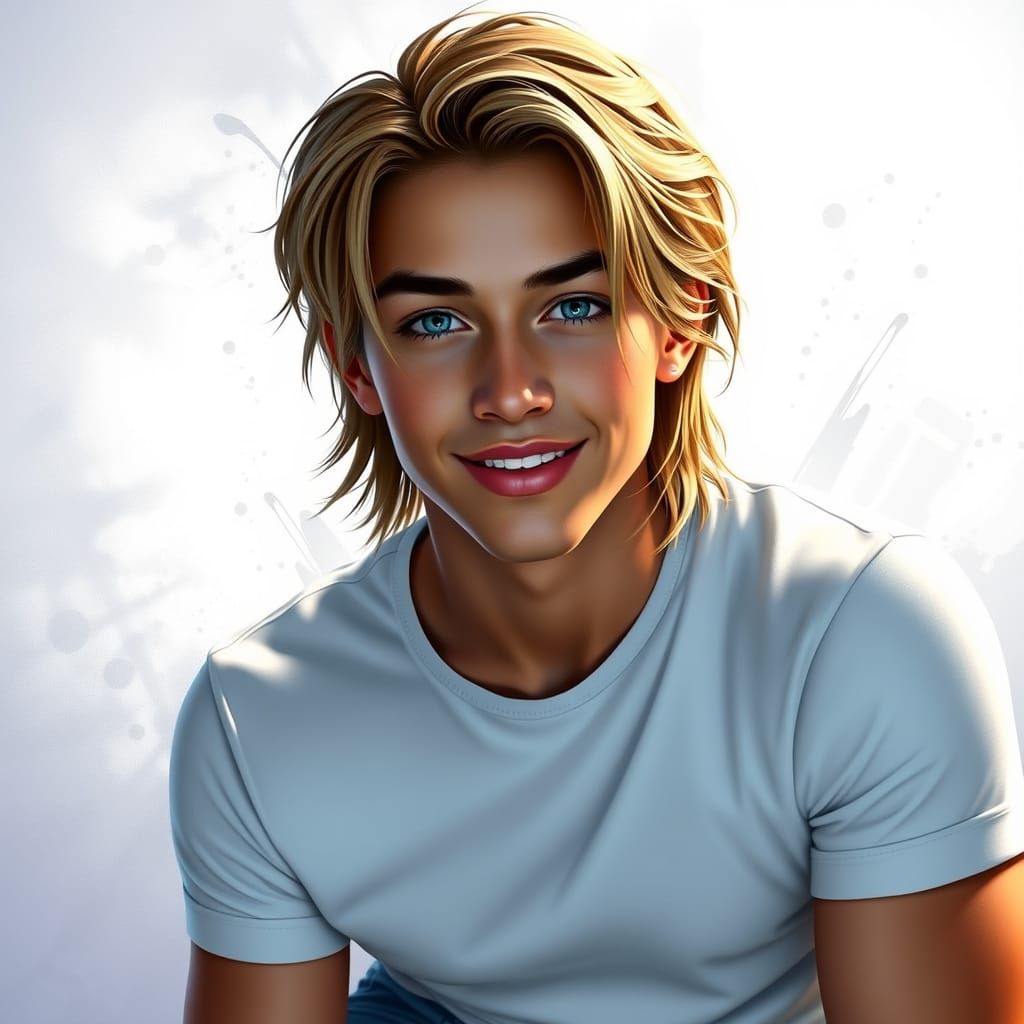 This concept art portrait features a flirty man with light tan skin and blonde-streaked brown hair. Rendered with dynamic lighting and triadic colors for a hyperdetailed splash art effect.