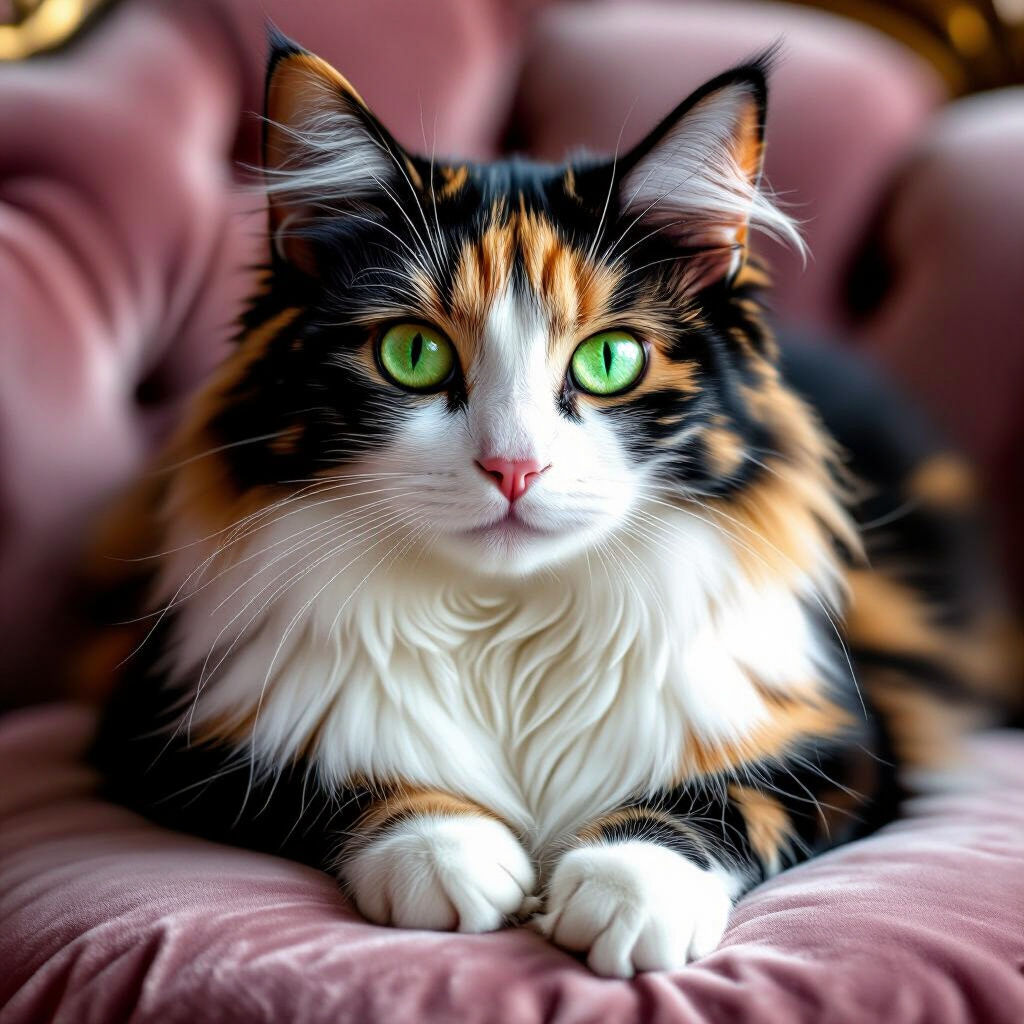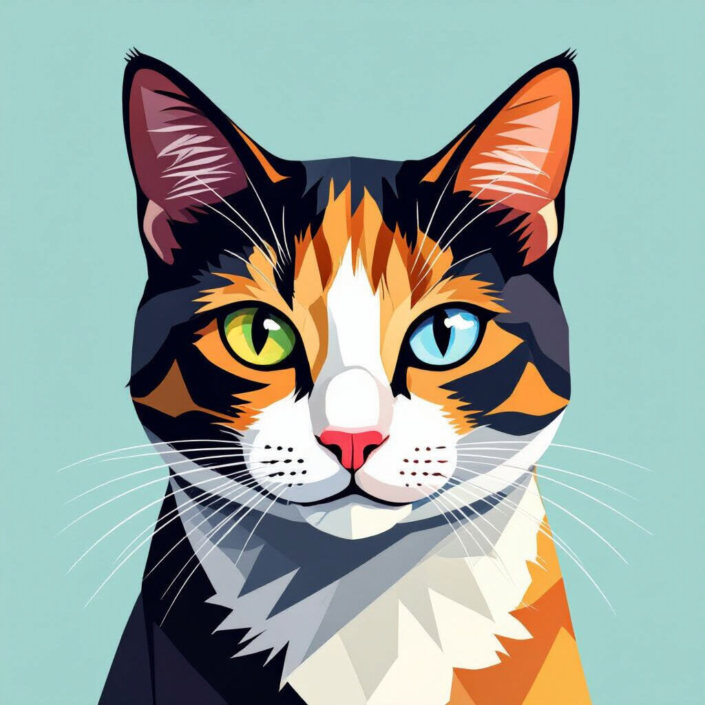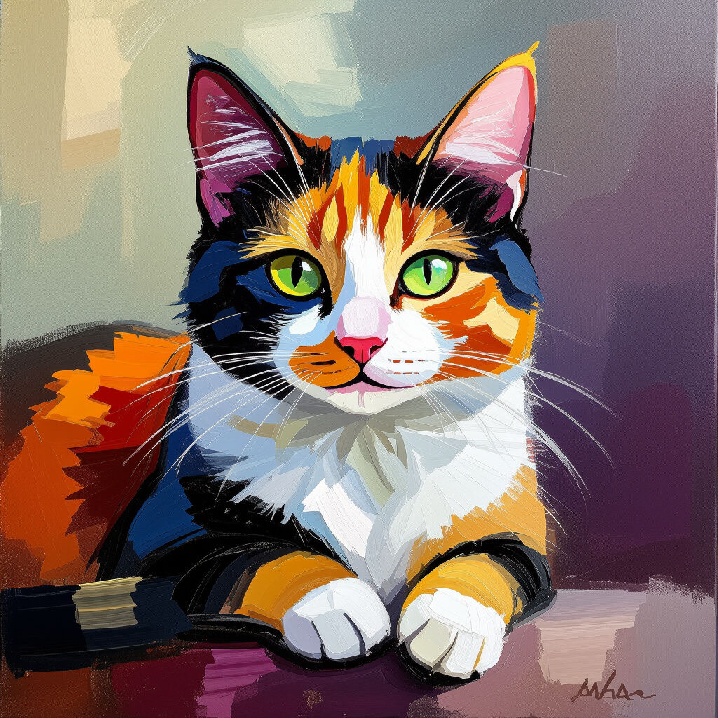 Describe the calico cat you envision in the prompt box. Be specific about its pose, expression, background, and artistic style. The more detail you provide, the closer the AI can get to your perfect feline friend!