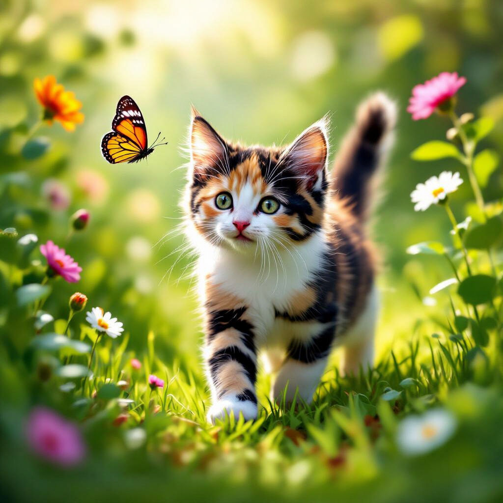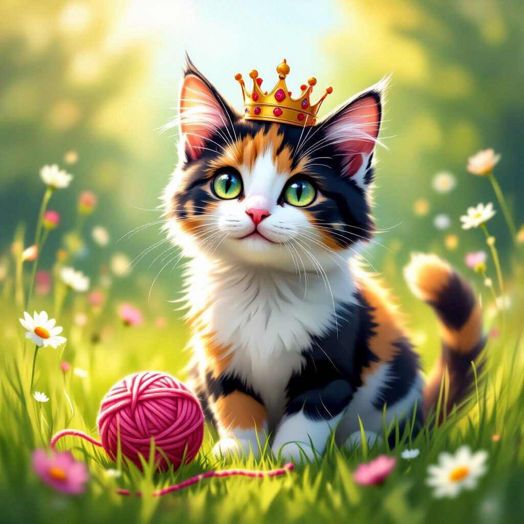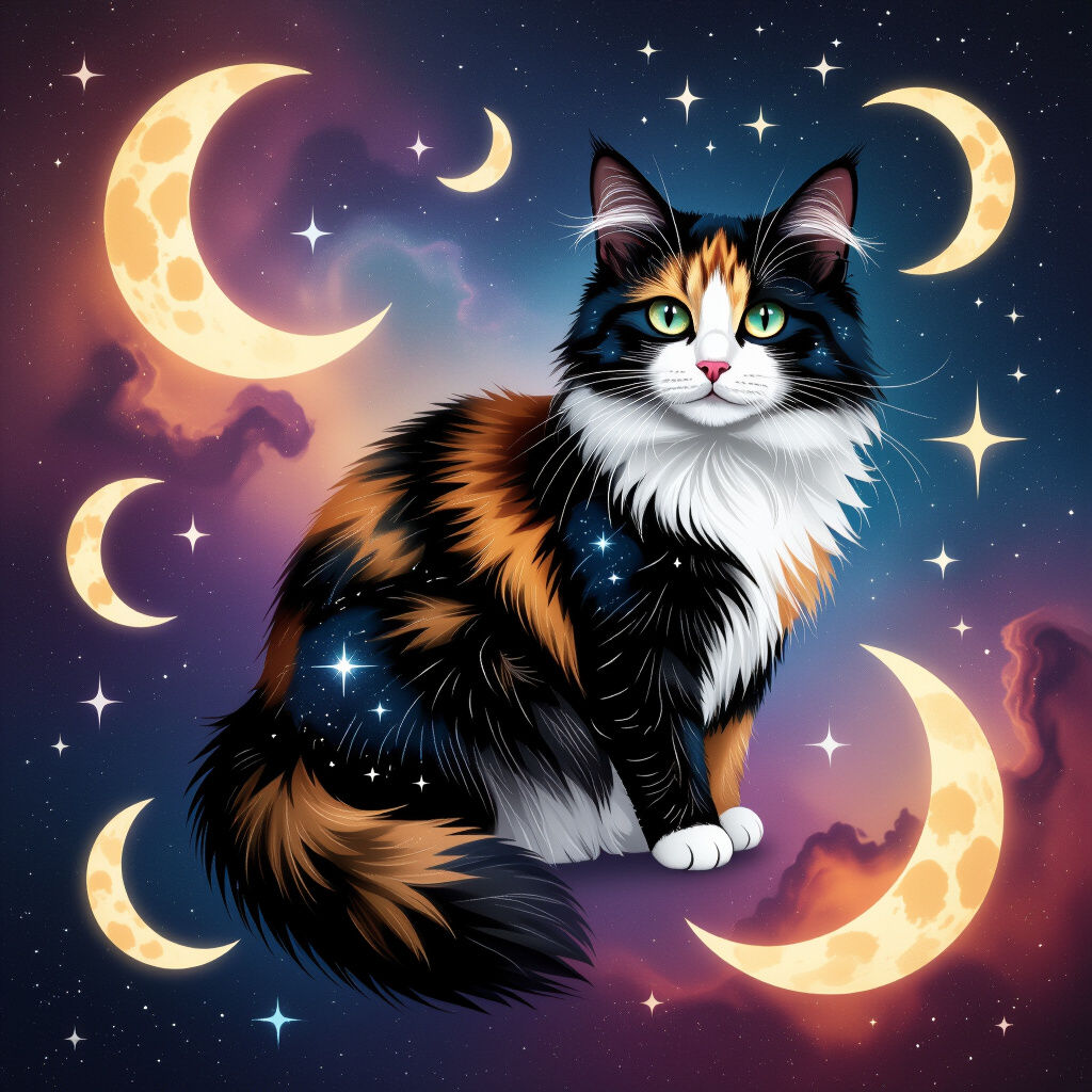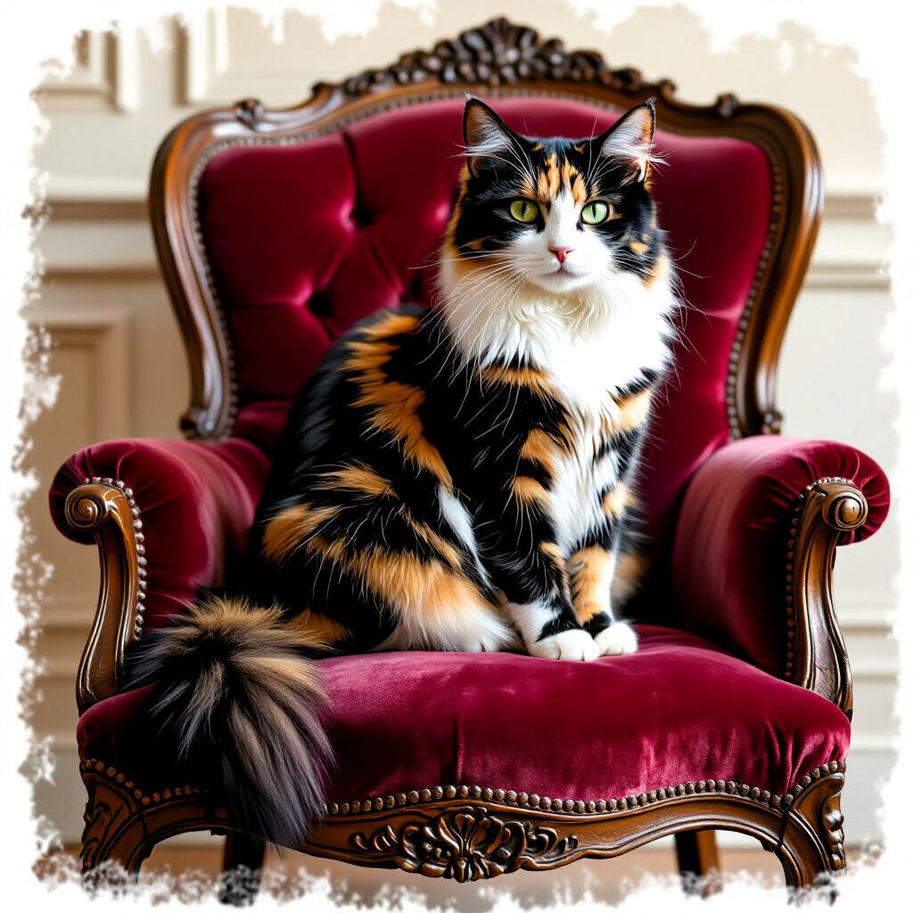 Describe the calico cat you envision in the prompt box. Be specific about its pose, expression, background, and artistic style. The more detail you provide, the closer the AI can get to your perfect feline friend!
